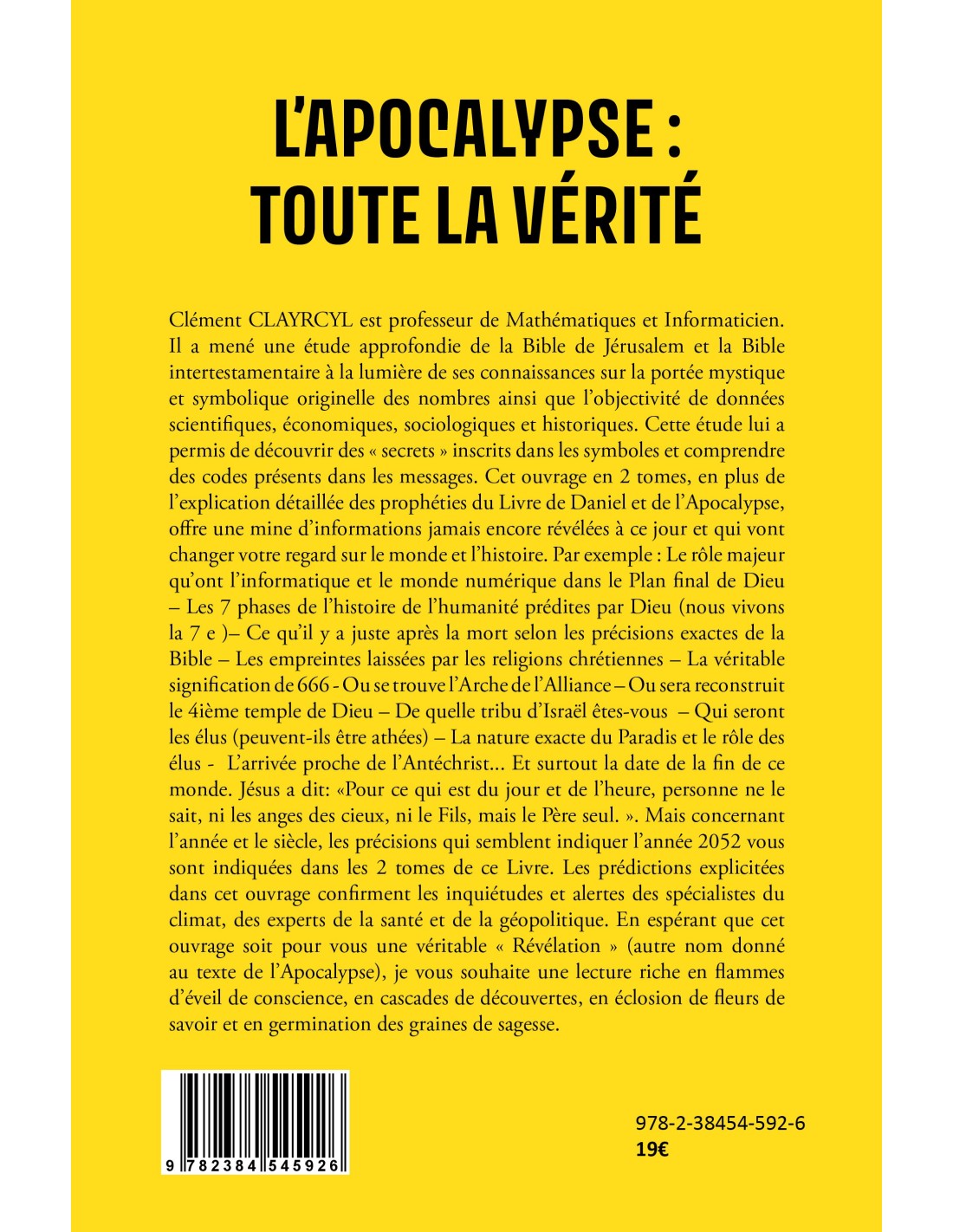 Clément CLAYRCYL est professeur de Mathématiques et Informaticien. Il a mené une étude approfondie de la Bible de Jérusalem et la Bible intertestamentaire à la lumière de ses connaissances sur la portée mystique et symbolique originelle des nombres ainsi que lobjectivité de données scientifiques, économiques, sociologiques et historiques. Cette étude lui a permis de découvrir des « secrets » inscrits dans les symboles et comprendre des codes présents dans les messages. Cet ouvrage en 2 tomes, en plus de lexplication détaillée des prophéties du Livre de Daniel et de lApocalypse, offre une mine dinformations jamais encore révélées à ce jour et qui vont changer votre regard sur le monde et lhistoire. Par exemple : Le rôle majeur quont linformatique et le monde numérique dans le Plan final de Dieu – Les 7 phases de lhistoire de lhumanité prédites par Dieu (nous vivons la 7 e )– Ce quil y a juste après la mort selon les précisions exactes de la Bible – Les empreintes laissées par les religions chrétiennes – La véritable signification de 666 - Ou se trouve lArche de lAlliance – Ou sera reconstruit le 4ième temple de Dieu – De quelle tribu dIsraël êtes-vous  – Qui seront les élus (peuvent-ils être athées) – La nature exacte du Paradis et le rôle des élus -  Larrivée proche de lAntéchrist... Et surtout la date de la fin de ce monde. Jésus a dit: «Pour ce qui est du jour et de lheure, personne ne le sait, ni les anges des cieux, ni le Fils, mais le Père seul. ». Mais concernant lannée et le siècle, les précisions qui semblent indiquer lannée 2052 vous sont indiquées dans les 2 tomes de ce Livre. Les prédictions explicitées dans cet ouvrage confirment les inquiétudes et alertes des spécialistes du climat, des experts de la santé et de la géopolitique. En espérant que cet ouvrage soit pour vous une véritable « Révélation » (autre nom donné au texte de lApocalypse), je vous souhaite une lecture riche en flammes d’éveil de conscience, en cascades de découvertes, en éclosion de fleurs de savoir et en germination des graines de sagesse.