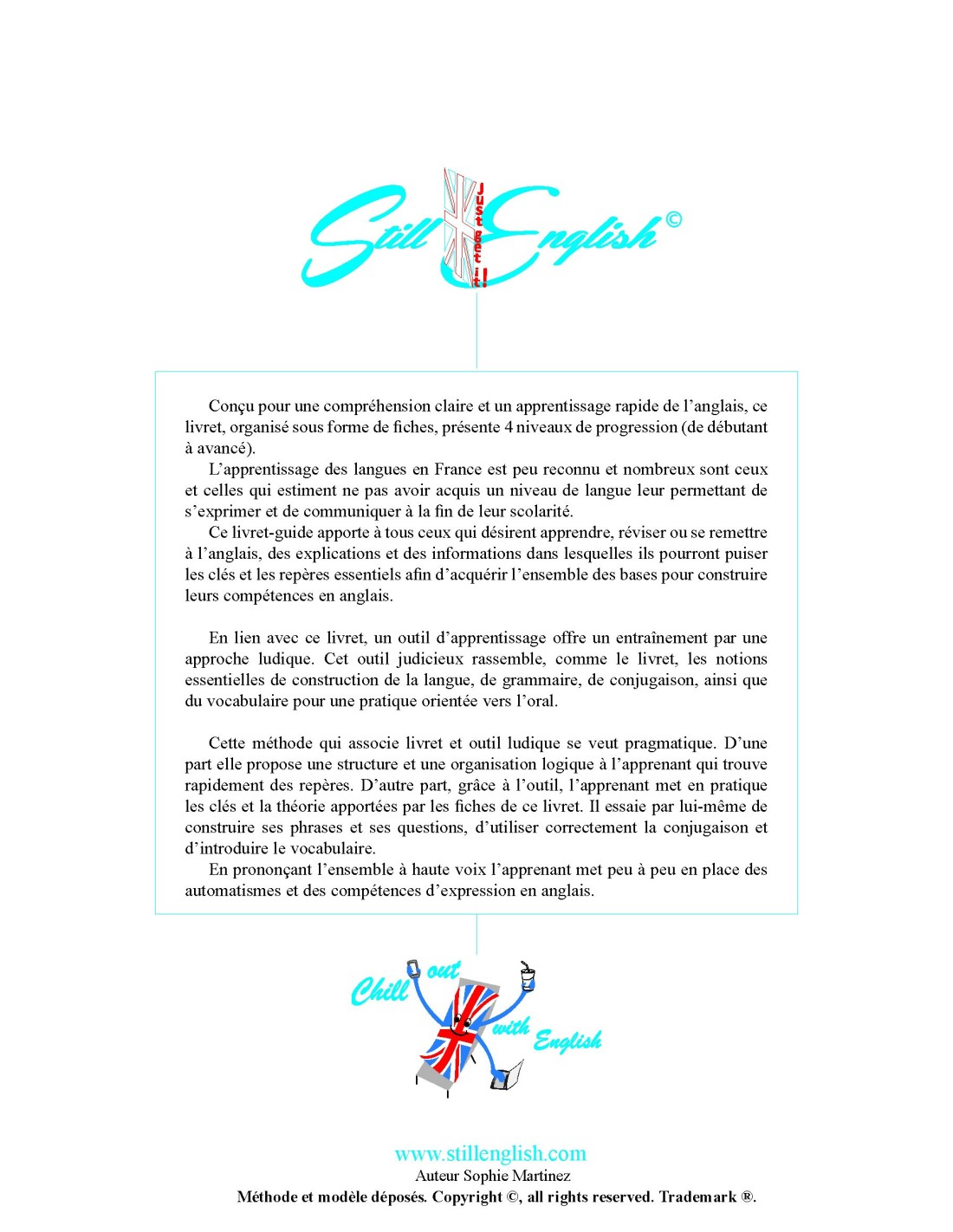 Conçu pour une compréhension claire et un apprentissage rapide de l'anglais, ce livret, organisé sous forme de fiches, présente 4 niveaux de progression (de débutant á avancé). L'apprentissage des langues en France est peu reconnu et nombreux sont ceux et celles qui estiment ne pas avoir acquis un niveau de langue leur permettant de s'exprimer et de communiquer à la fin de leur scolarité. Ce livret-guide apporte à tous ceux qui désirent apprendre, réviser ou se remettre á l'anglais, des explications et des informations dans lesquelles ils pourront puiser les clés et les repères essentiels afin d'acquérir l'ensemble des bases pour construire leurs compétences en anglais. En lien avec ce livret, un outil d'apprentissage offre un entraînement par une approche ludique. Cet outil judicieux rassemble, comme le livret, les notions essentielles de construction de la langue, de grammaire, de conjugaison, ainsi que du vocabulaire pour une pratique orientée vers l'oral. Cette méthode qui associe livret et outil ludique se veut pragmatique. D'une part elle propose une structure et une organisation logique à l'apprenant qui trouve rapidement des repères. D'autre part, grâce à l'outil, l'apprenant met en pratique les clés et la théorie apportées par les fiches de ce livret. Il essaie par lui-même de construire ses phrases et ses questions, d'utiliser correctement la conjugaison et d'introduire le vocabulaire. En prononçant l'ensemble à haute voix l'apprenant met peu à peu en place des automatismes et des compétences d'expression en anglais. Livret d'anglais : Fiches simplifiées, pratiques, colorées. Théorie de l'anglais essentielle simplifiée pour des bases solides en anglais. Contenu progressif, complet, évolutif. A partir de 8 ans, jeunes et adultes. Tous niveaux - débutant à avancé. Les couleurs pour faciliter la mémorisation. Construction phrases et questions, organisation, repères temps, modalité, grammaire, adjectifs, verbes essentiels courants. Prononciation du vocabulaire pour une lecture seul. Pour un livret multi génération à se transmettre de parents à enfants et grands-parents. Convient idéalement aux écoles, professeurs, formateurs, ainsi qu'aux particuliers. Souhaitant que vous en apprécierez le contenu.
