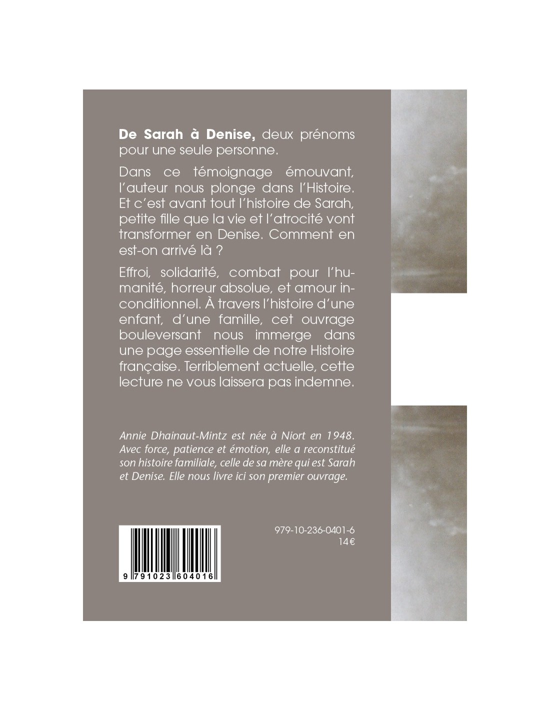 De Sarah à Denise, deux prénoms pour une seule personne. Dans ce témoignage émouvant, l’auteur nous plonge dans l’Histoire. Et c’est avant tout l’histoire de Sarah, petite fille que la vie et l’atrocité vont transformer en Denise. Comment en est-on arrivé là ? Effroi, solidarité, combat pour l’humanité, horreur absolue, et amour inconditionnel. À travers l’histoire d’une enfant, d’une famille, cet ouvrage bouleversant nous immerge dans une page essentielle de notre Histoire française. Terriblement actuel, cette lecture essentielle ne vous laissera pas indemne.
