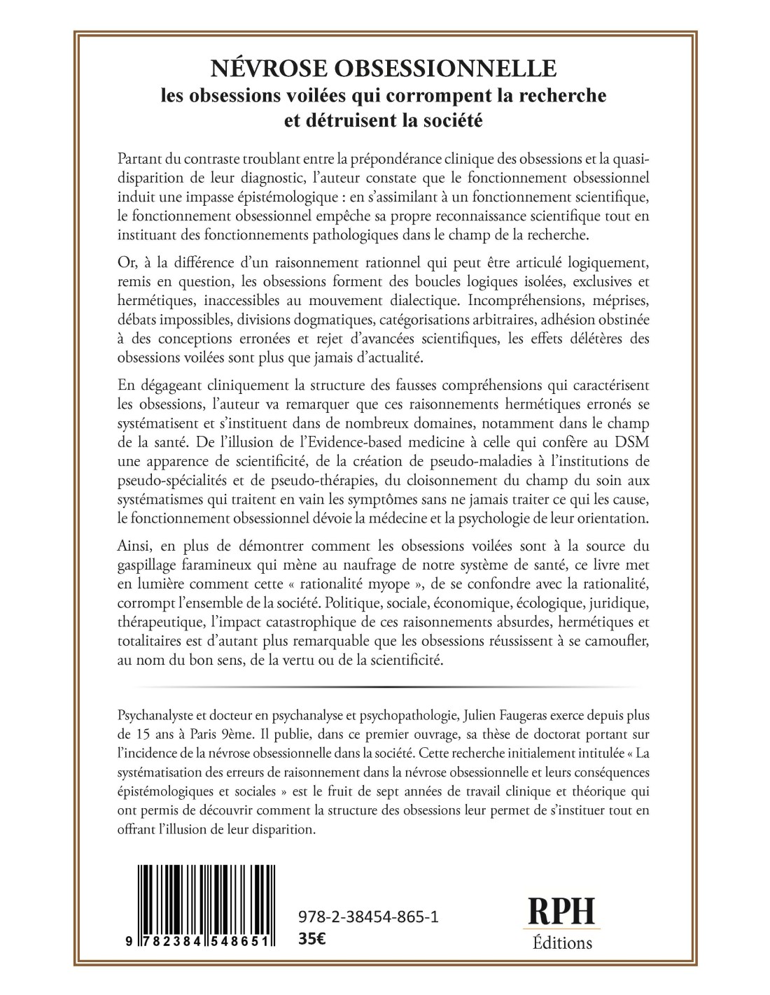 Psychanalyste et docteur en psychanalyse et psychopathologie, Julien Faugeras exerce depuis plus de 15 ans à Paris 9ème. Il publie, dans ce premier ouvrage, sa thèse de doctorat portant sur l’incidence de la névrose obsessionnelle dans la société. Cette recherche initialement intitulée « La systématisation des erreurs de raisonnement dans la névrose obsessionnelle et leurs conséquences épistémologiques et sociales » est le fruit de sept années de travail clinique et théorique qui ont permis de découvrir comment la structure des obsessions leur permet de s’instituer tout en offrant l’illusion de leur disparition.