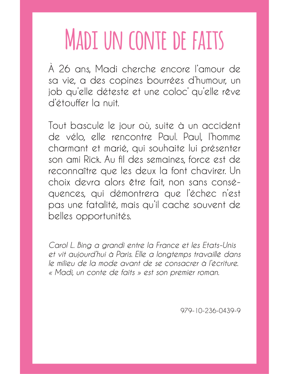 À 26 ans, Madi cherche encore l'amour de sa vie, a des copines bourrées d'humour, un job qu'elle déteste et une coloc' qu'elle rêve d'étouffer la nuit. Tout bascule le jour où, suite à un accident de vélo, elle rencontre Paul. Paul, l'homme charmant et marié, qui souhaite lui présenter son ami Rick. Au fil des semaines, force est de reconnaître que les deux la font chavirer. Un choix devra alors être fait, non sans conséquences, qui démontrera que l'échec n'est pas une fatalité, mais qu'il cache souvent de belles opportunités. Premier roman.