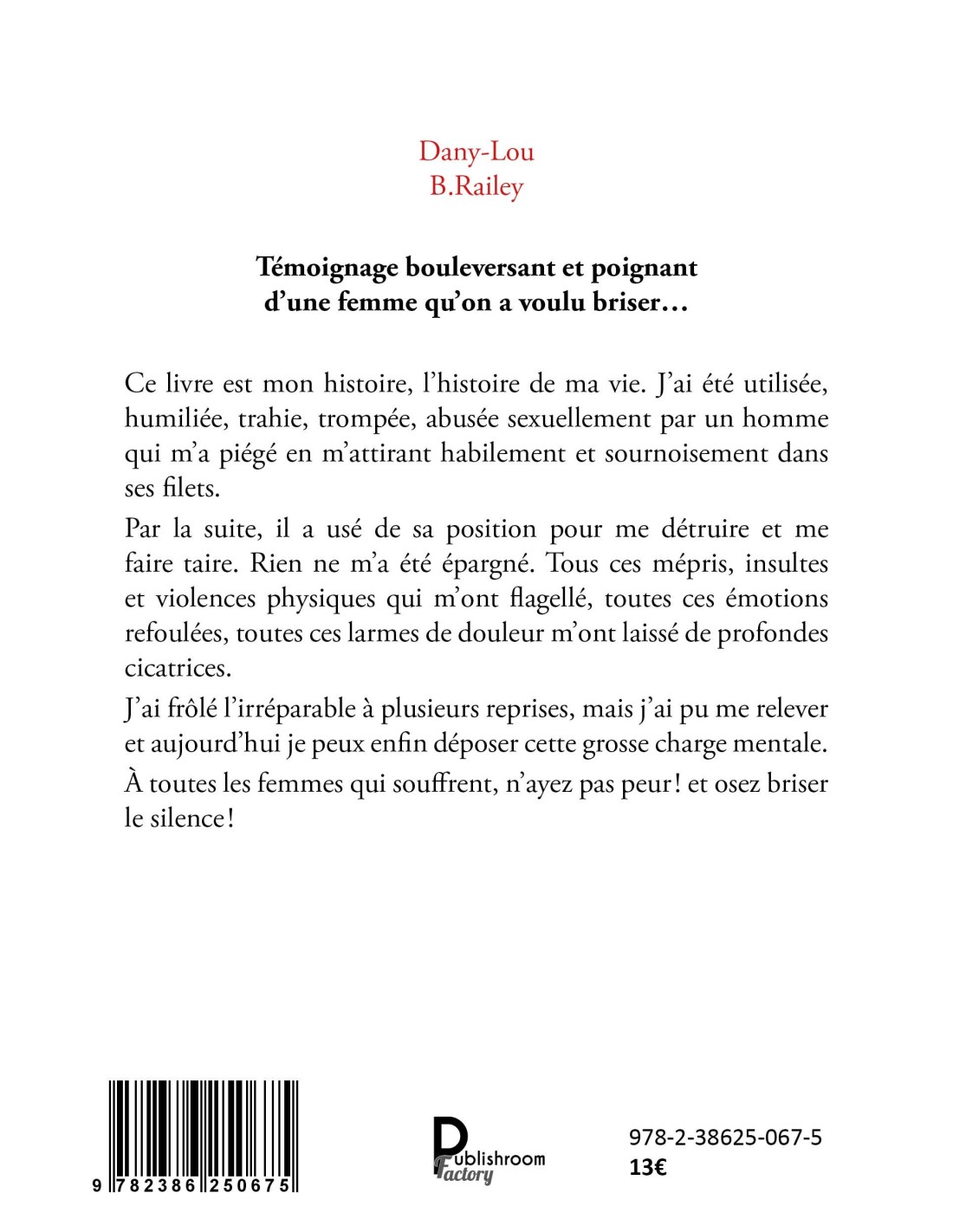 Ce livre est mon histoire, l’histoire de ma vie. J’ai été utilisée, humiliée, trahie, trompée, abusée sexuellement par un homme qui m’a piégé en m’attirant habilement et sournoisement dans ses filets.
