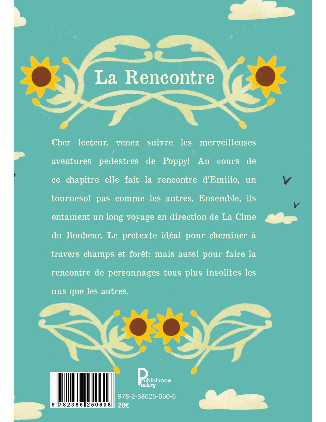 Cher lecteur, venez suivre les merveilleuses aventures pédestres de Poppy ! Au cours de ce chapitre elle fait la rencontre d’Emilio, un tournesol pas comme les autres. Ensemble, ils entament un long voyage en direction de La Cime du Bonheur. Le prétexte idéal pour cheminer à travers champs et forêts ; mais aussi pour faire la rencontre de personnages tous plus insolites les uns que les autres.