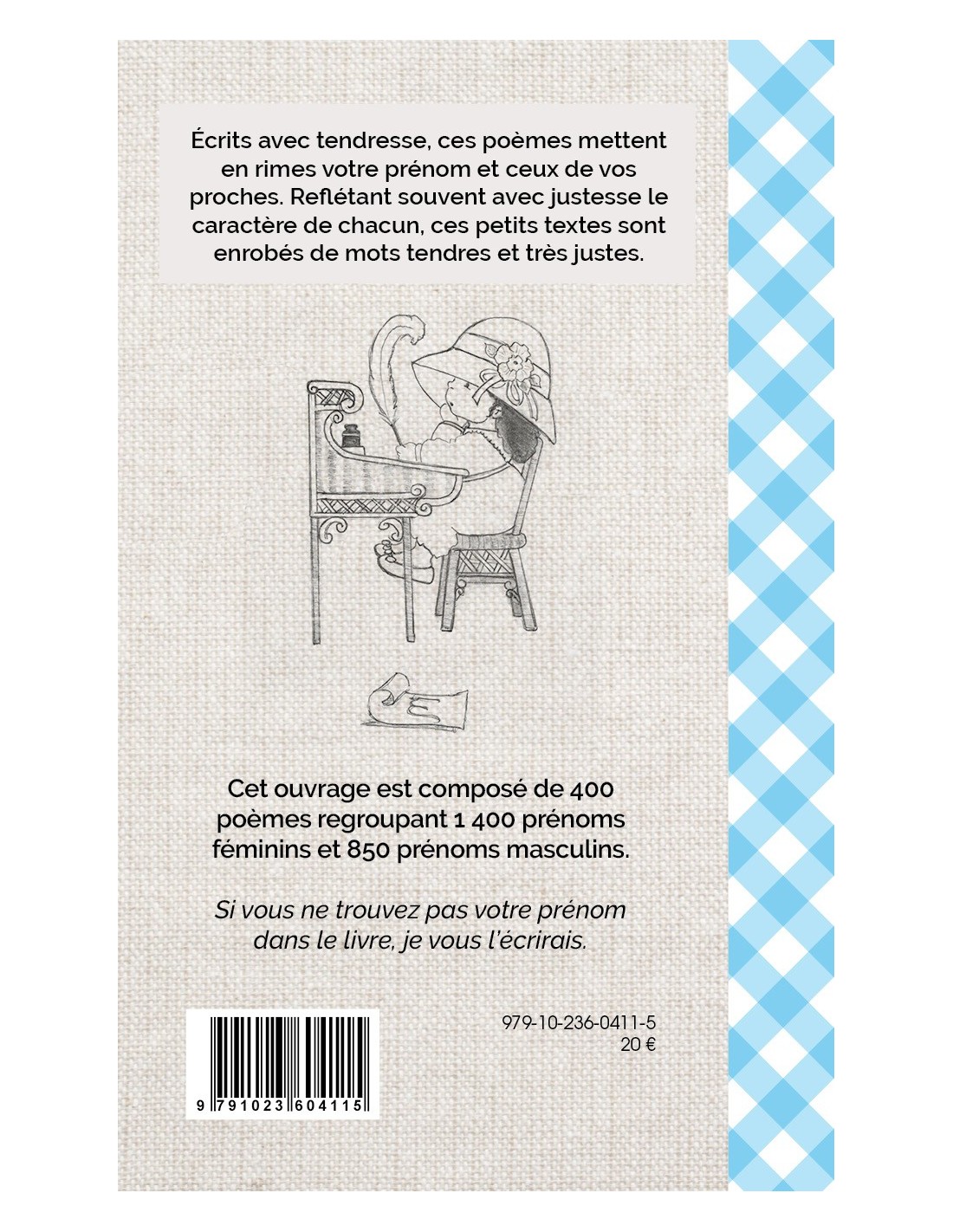 Ce livre a la particularité de transformer vos prénoms en douces poésies. Écrit avec tendresse, ces poèmes mettent en rimes votre prénom et ceux de vos proches. Reflétant souvent avec justesse le caractère des individus, ces petits textes sont enrobés de mots tendres pour qu’ils soient plus plaisants.