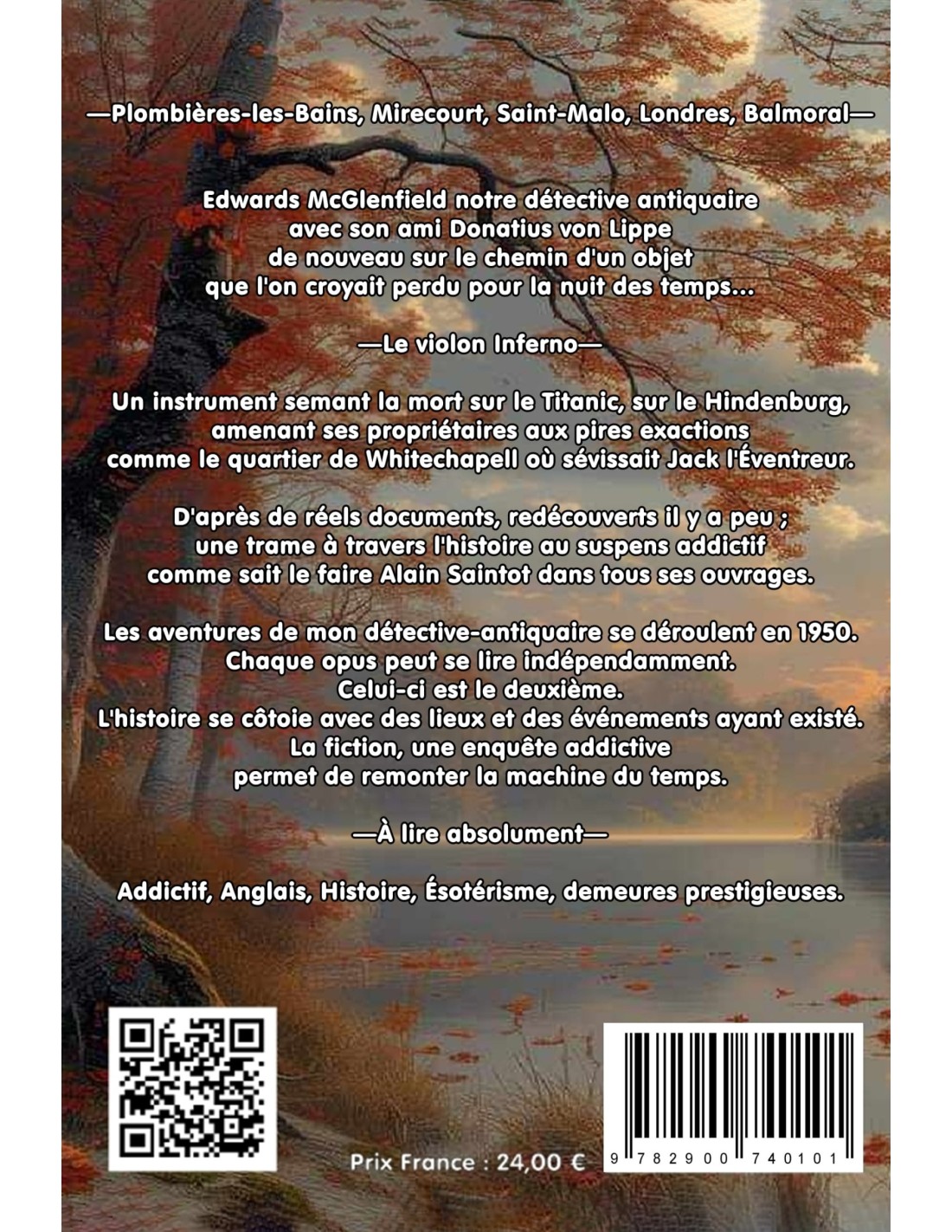 | -Plombières-les-Bains, Mirecourt, Saint-Malo, Londres, Balmoral- Edwards McGlenfield notre détective antiquaire avec son ami Donatius von Lippe de nouveau sur le chemin d'un objet que l'on croyait perdu dans la nuit des temps… -Le violon Inferno- Un instrument semant la mort sur le Titanic, sur le Hindenburg, amenant ses propriétaires aux pires exactions comme le quartier de Whitechapell où sévissait Jack l'Éventreur. D'après de réels documents, redécouverts il y a peu ; une trame à travers l'histoire au suspens addictif comme sait le faire Alain Saintot dans tous ses ouvrages. Les aventures de mon détective-antiquaire se déroulent en 1950. Chaque opus peut se lire indépendamment. Celui-ci est le deuxième. L'histoire se côtoie avec des lieux et des évènements ayant existé. La fiction, une enquête addictive permet de remonter la machine du temps. -À lire absolument- Addictif, Anglais, Histoire, Ésotérisme, demeures prestigieuses. |