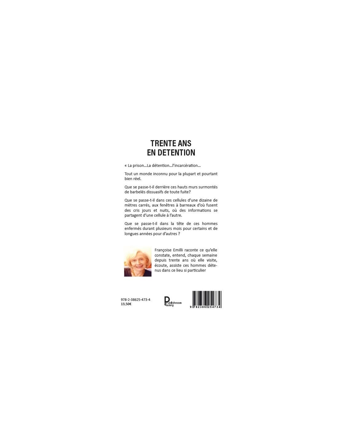 « La prison…La détention…l’incarcération… Tout un monde inconnu pour la plupart et pourtant bien réel. Que se passe-t-il derrière ces hauts murs surmontés de barbelés dissuasifs de toute fuite ? Que se passe-t-il dans ces cellules d’une dizaine de mètres carrés, aux fenêtres à barreaux d’où fusent des cris jours et nuits, où des informations se partagent d’une cellule à l’autre. Que se passe-t-il dans la tête de ces hommes enfermés durant plusieurs mois pour certains et de longues années pour d’autres ? Françoise Emilli raconte ce qu’elle constate, entend, chaque semaine depuis trente ans où elle visite, écoute, assiste ces hommes détenus dans ce lieu si particulier