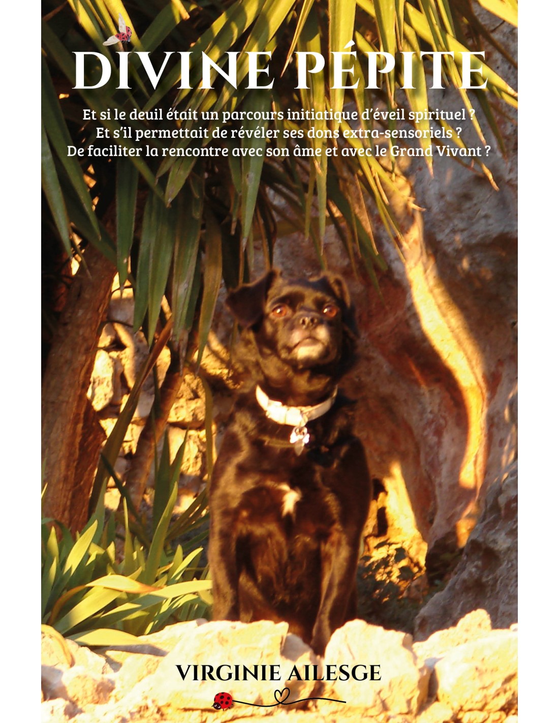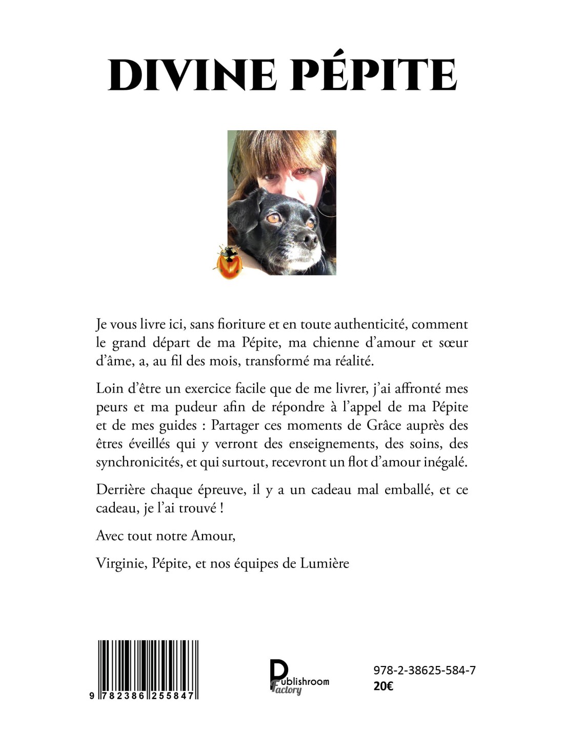 Je vous livre ici, sans fioriture et en toute authenticité, comment le grand départ de ma Pépite, ma chienne d’amour et sœur d’âme, a, au fil des mois, transformé ma réalité. Loin d’être un exercice facile que de me livrer, j’ai affronté mes peurs et ma pudeur afin de répondre à l’appel de ma Pépite et de mes guides : Partager ces moments de Grâce auprès des êtres éveillés qui y verront des enseignements, des soins, des synchronicités, et qui surtout, recevront un flot d’amour inégalé. Derrière chaque épreuve, il y a un cadeau mal emballé, et ce cadeau, je l’ai trouvé! Avec tout notre Amour, Virginie, Pépite, et nos équipes de Lumière