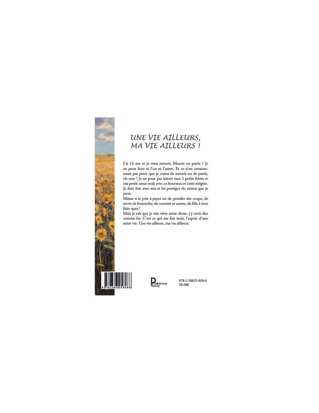 J’ai 16 ans et je veux mourir. Mourir ou partir ? Je ne peux faire ni l’un ni l’autre. Et ce n’est certainement pas parce que je crains de mourir ou de partir, oh non ! Je ne peux pas laisser mes 2 petits frères et ma petite sœur seuls avec ce bourreau et cette mégère. Je dois être avec eux et les protéger du mieux que je peux. Même si le prix à payer est de prendre des coups, de servir de bonniche, de coursier et autres, de fille à tout faire quoi ! Mais je sais que je vais vivre autre chose, j’y crois dur comme fer. C’est ce qui me fait tenir, l’espoir d’une autre vie. Une vie ailleurs, ma vie ailleurs.