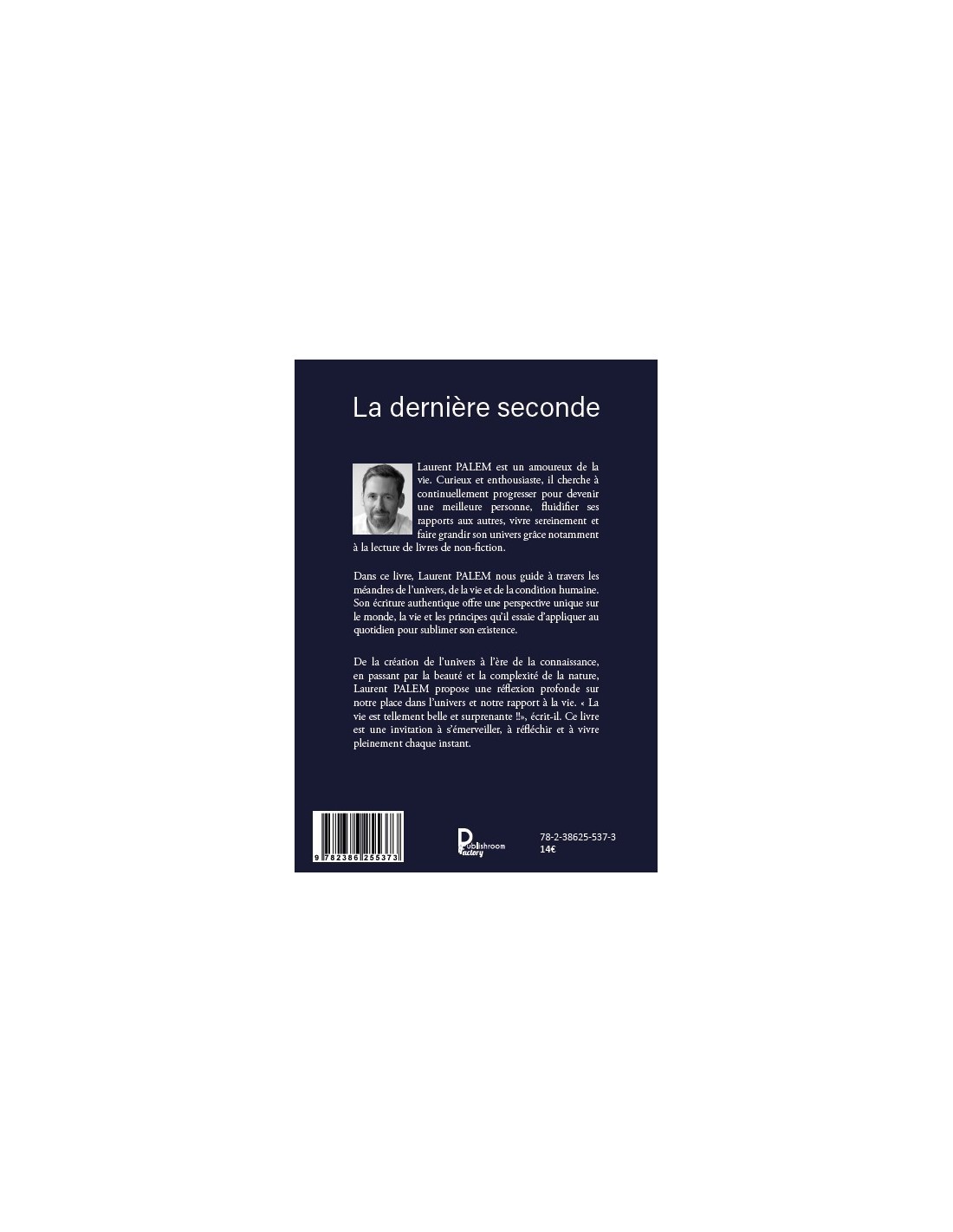 Laurent PALEM est un amoureux de la vie. Curieux et enthousiaste, il cherche à continuellement progresser pour devenir une meilleure personne, fluidifier ses rapports aux autres, vivre sereinement et faire grandir son univers grâce notamment à la lecture de livres de non-fiction. La dernière seconde La dernière seconde Laurent PALEM Dans ce livre, Laurent PALEM nous guide à travers les méandres de l’univers, de la vie et de la condition humaine. Son écriture authentique o_ re une perspective unique sur le monde, la vie et les principes qu’il essaie d’appliquer au quotidien pour sublimer son existence. De la création de l’univers à l’ère de la connaissance, en passant par la beauté et la complexité de la nature, Laurent PALEM propose une réflexion profonde sur notre place dans l’univers et notre rapport à la vie. « La vie est tellement belle et surprenante !!», écrit-il. Ce livre est une invitation à s’émerveiller, à réfléchir et à vivre pleinement chaque instant.