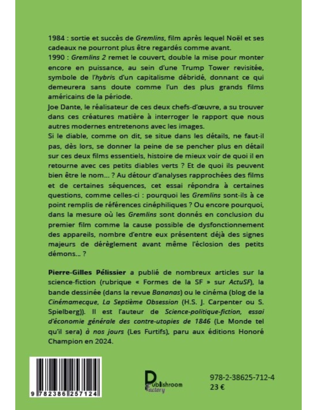 1984 : sortie et succès de Gremlins, film après lequel Noël et ses cadeaux ne pourront plus être regardés comme avant. 1990 : Gremlins 2 remet le couvert, double la mise pour monter encore en puissance, au sein d’une Trump Tower revisitée, symbole de l’hybris d’un capitalisme débridé, donnant ce qui demeurera sans doute comme l’un des plus grands films américains de la période. Joe Dante, le réalisateur de ces deux chefs-d’oeuvre, a su trouver dans ces créatures matière à interroger le rapport que nous autres modernes entretenons avec les images. Si le diable, comme on dit, se situe dans les détails, ne faut-il pas, dès lors, se donner la peine de se pencher plus en détail sur ces deux films essentiels, histoire de mieux voir de quoi il en retourne avec ces petits diables verts ? Et de quoi ils peuvent bien être le nom... ? Au détour d’analyses rapprochées des films et de certaines séquences, cet essai répondra à certaines questions, comme celles-ci : pourquoi les Gremlins sont-ils à ce point remplis de références cinéphiliques ? Ou encore pourquoi, dans la mesure où les Gremlins sont donnés en conclusion du premier film comme la cause possible de dysfonctionnement des appareils, nombre d’entre eux présentent déjà des signes majeurs de dérèglement avant même l’éclosion des petits démons… ? Pierre-Gilles Pélissier a publié de nombreux articles sur la science-fiction (rubrique « Formes de la SF » sur ActuSF), la bande dessinée (dans la revue Bananas) ou le cinéma (blog de la Cinémamecque, La Septième Obsession (H.S. J. Carpenter ou S. Spielberg)). Il est l’auteur de Science-politique-fiction, essai d’économie générale des contre-utopies de 1846 (Le Monde tel qu’il sera) à nos jours (Les Furtifs), paru aux éditions Honoré Champion en 2024.