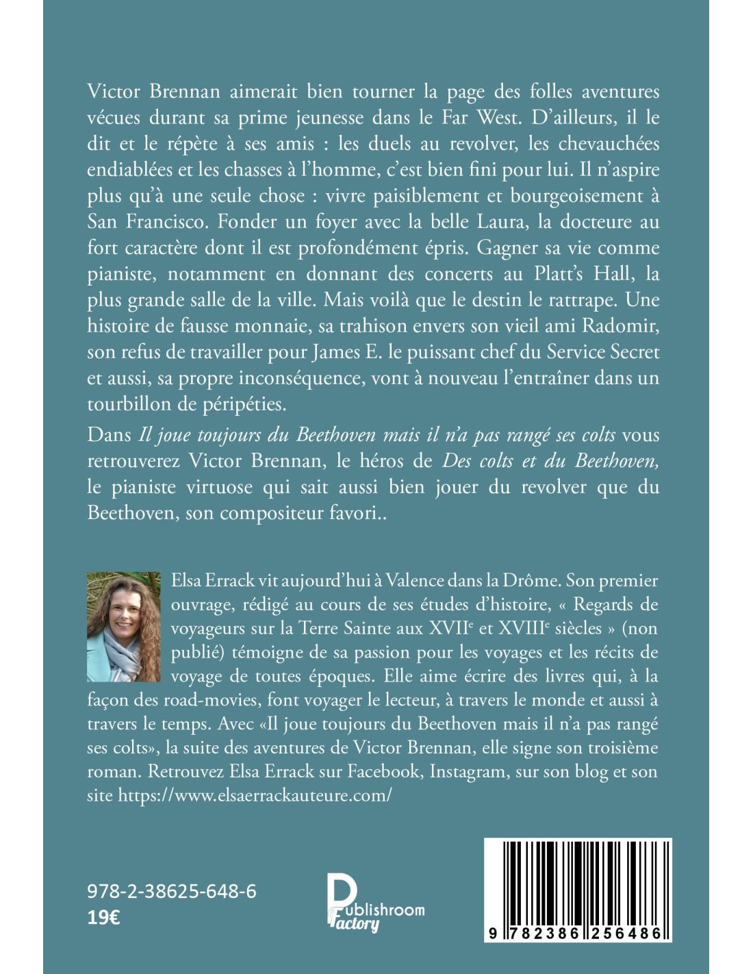 Elsa Errack vit aujourd’hui à Valence dans la Drôme. Son premier ouvrage, rédigé au cours de ses études d’histoire, « Regards de voyageurs sur la Terre Sainte aux XVIIe et XVIIIe siècles » (non publié) témoigne de sa passion pour les voyages et les récits de voyage de toutes époques. Elle aime écrire des livres qui, à la façon des road-movies, font voyager le lecteur, à travers le monde et aussi à travers le temps. Avec «Il joue toujours du Beethoven mais il n’a pas rangé ses colts», la suite des aventures de Victor Brennan, elle signe son troisième roman. Retrouvez Elsa Errack sur Facebook, Instagram, sur son blog et son site https://www.elsaerrackauteure.com/