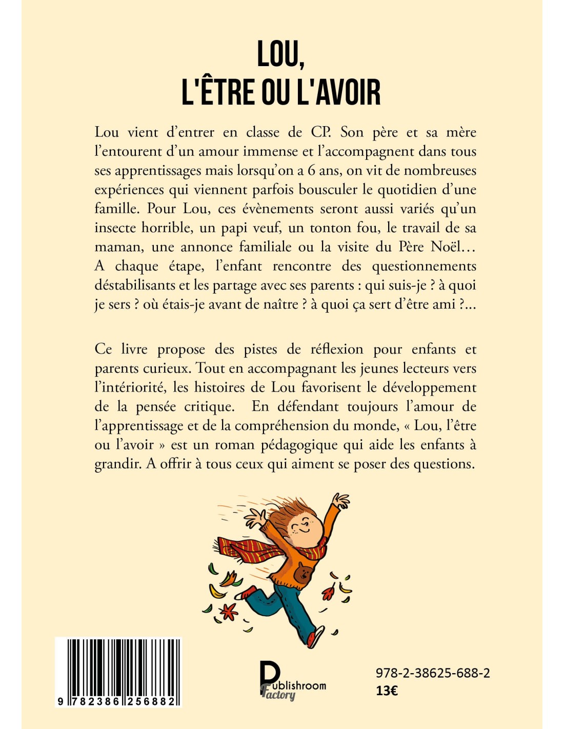 Lou vient d’entrer en classe de CP. Son père et sa mère l’entourent d’un amour immense et l’accompagnent dans tous ses apprentissages mais lorsqu’on a 6 ans, on vit de nombreuses expériences qui viennent parfois bousculer le quotidien d’une famille. Pour Lou, ces évènements seront aussi variés qu’un insecte horrible, un papi veuf, un tonton fou, le travail de sa maman, une annonce familiale ou la visite du Père Noël… A chaque étape, l’enfant rencontre des questionnements déstabilisants et les partage avec ses parents : qui suis-je ? à quoi je sers ? où étais-je avant de naître ? à quoi ça sert d’être ami ?... Ce livre propose des pistes de réflexion pour enfants et parents curieux. Tout en accompagnant les jeunes lecteurs vers l’intériorité, les histoires de Lou favorisent le développement de la pensée critique. En défendant toujours l’amour de l’apprentissage et de la compréhension du monde, « Lou, l’être ou l’avoir » est un roman pédagogique qui aide les enfants à grandir. A offrir à tous ceux qui aiment se poser des questions.