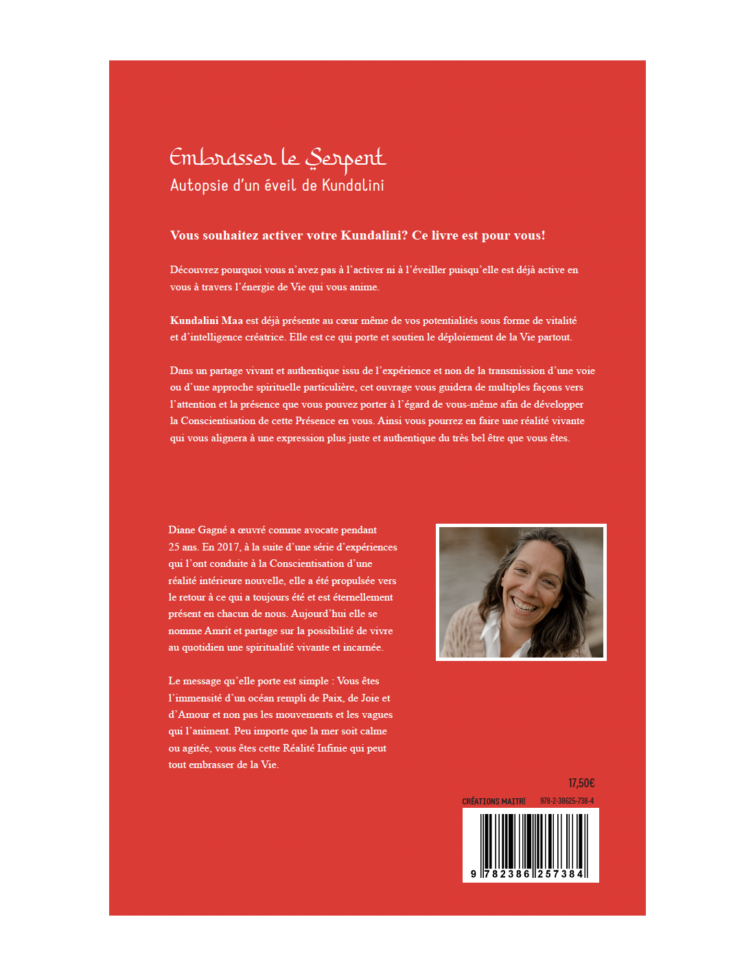 Vous souhaitez activer votre Kundalini ? Ce livre est pour vous ! Découvrez pourquoi vous n’avez pas à l’activer ni à l’éveiller puisqu’elle est déjà active en vous à travers l’énergie de Vie qui vous anime. Kundalini Maa est déjà présente au coeur même de vos potentialités sous forme de vitalité et d’intelligence créatrice. Elle est ce qui porte et soutien le déploiement de la Vie partout. Dans un partage vivant et authentique issu de l’expérience et non de la transmission d’une voie ou d’une approche spirituelle particulière, cet ouvrage vous guidera de multiples façons vers l’attention et la présence que vous pouvez porter à l’égard de vous-même afin de développer la Conscientisation de cette Présence en vous. Ainsi vous pourrez en faire une réalité vivante qui vous alignera à une expression plus juste et authentique du très bel être que vous êtes.