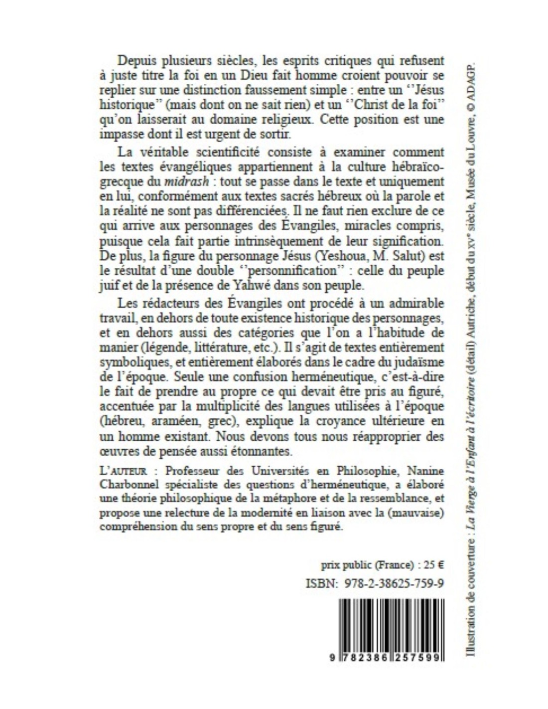 Depuis plusieurs siècles, les esprits critiques qui refusent à juste titre la foi en un Dieu fait homme croient pouvoir se replier sur une distinction faussement simple : entre un ‘’Jésus historique’’ (mais dont on ne sait rien) et un ‘’Christ de la foi’’ qu’on laisserait au domaine religieux. Cette position est une impasse dont il est urgent de sortir. La véritable scientificité consiste à examiner comment les textes évangéliques appartiennent à la culture hébraïco-grecque du midrash : tout se passe dans le texte et uniquement en lui, conformément aux textes sacrés hébreux où la parole et la réalité ne sont pas différenciées. Il ne faut rien exclure de ce qui arrive aux personnages des Évangiles, miracles compris, puisque cela fait partie intrinsèquement de leur signification. De plus, la figure du personnage Jésus (Yeshoua, M. Salut) est le résultat d’une double ‘’personnification’’ : celle du peuple juif et de la présence de Yahwé dans son peuple. Les rédacteurs des Évangiles ont procédé à un admirable travail, en dehors de toute existence historique des personnages, et en dehors aussi des catégories que l’on a l’habitude de manier (légende, littérature, etc.). Il s’agit de textes entièrement symboliques, et entièrement élaborés dans le cadre du judaïsme de l’époque. Seule une confusion herméneutique, c’est-à-dire le fait de prendre au propre ce qui devait être pris au figuré, accentuée par la multiplicité des langues utilisées à l’époque (hébreu, araméen, grec), explique la croyance ultérieure en un homme existant. Nous devons tous nous réapproprier des œuvres de pensée aussi étonnantes.
