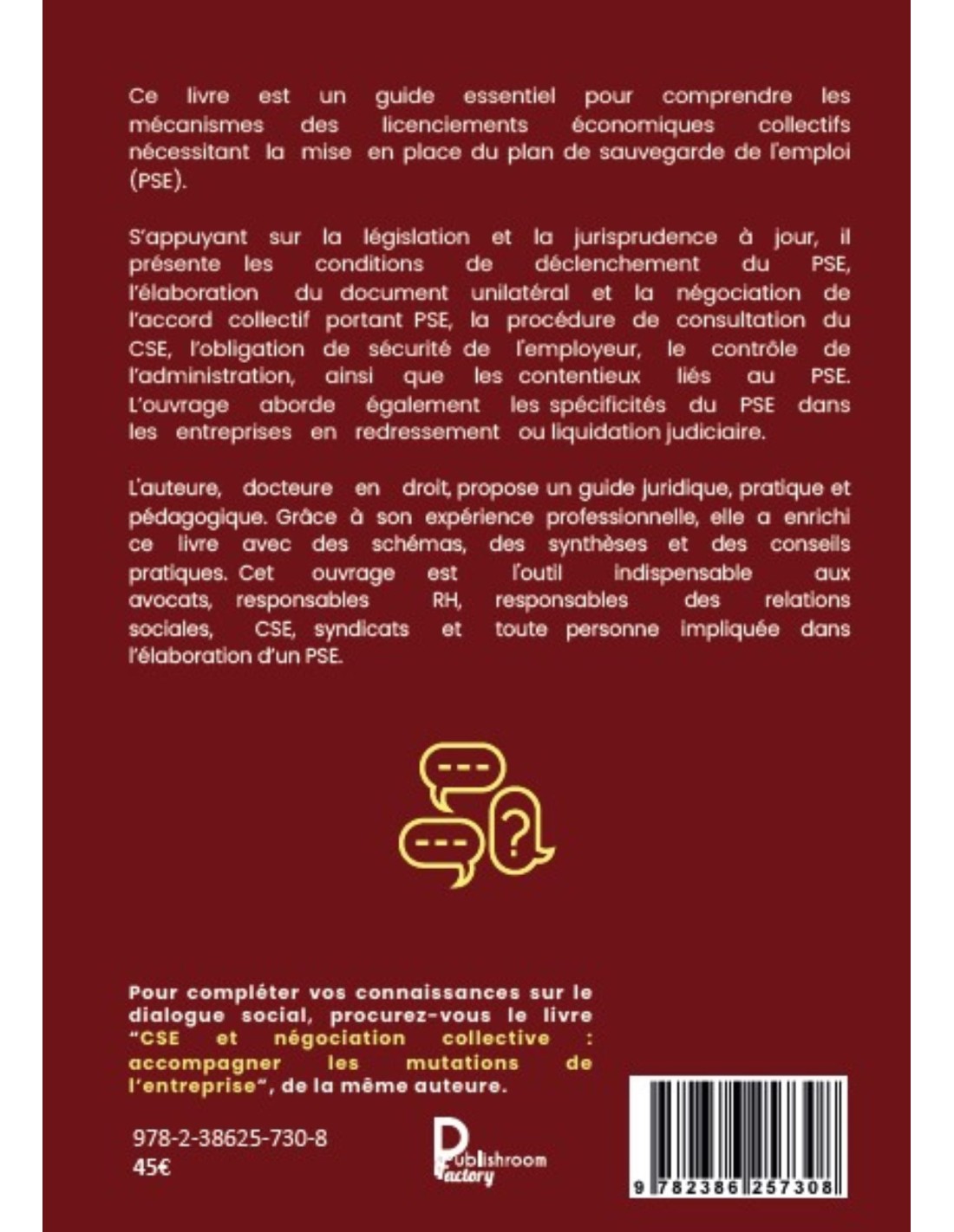 L'auteure, docteure en droit, propose un guide juridique, pratique et pédagogique. Grâce à son expérience professionnelle, elle a enrichi ce livre avec des schémas, des synthèses et des conseils pratiques. Cet ouvrage est l'outil indispensable aux avocats, responsables RH, responsables des relations sociales, CSE, syndicats et toute personne impliquée dans l’élaboration d’un PSE.