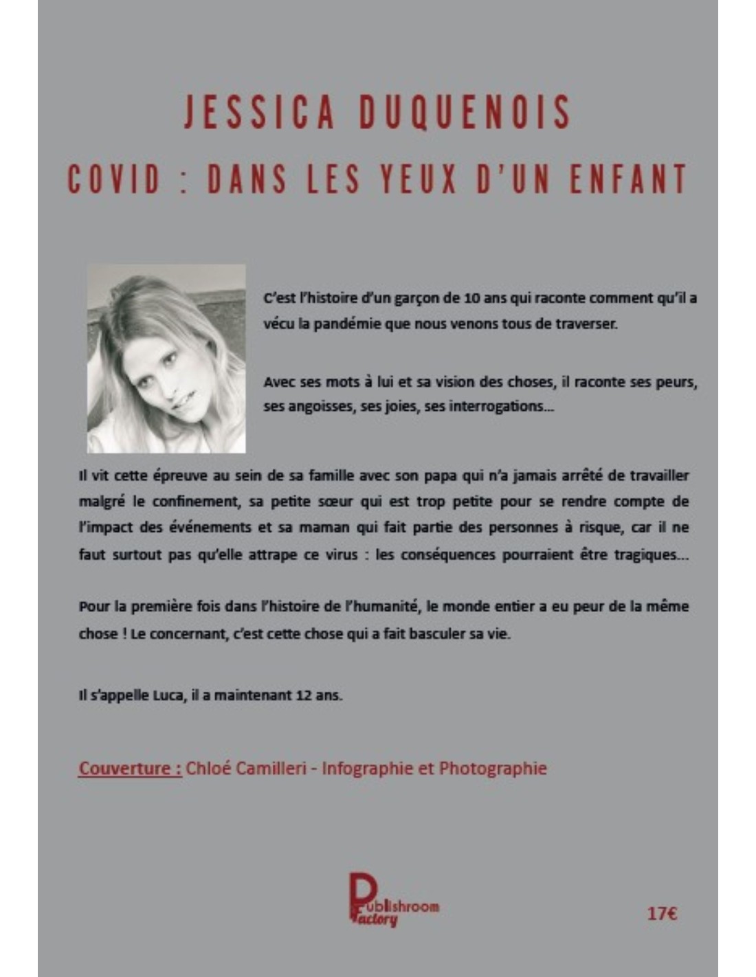 Ce livre a été à mes yeux une issue de secours pendant le confinement. Il m’a été inspiré par mon fils de 10 ans « à l’époque ». A travers ses yeux, ses questions, ses angoisses, ses peurs, ses émotions j’ai trouvé l’inspiration pour poser des mots sur ce que nous vivions et nous ressentions pendant cette période. Nous sommes une famille modeste composée de 4 personnes (papa, maman, Luca, et petite sœur) Papa travaille dans la métallurgie et moi je suis secrétaire médicale. Une part de fiction anime ce livre, mais les grandes lignes sont bien réelles. Cette histoire fera partie d’une génération entière et aura des conséquences sur les générations avenir.