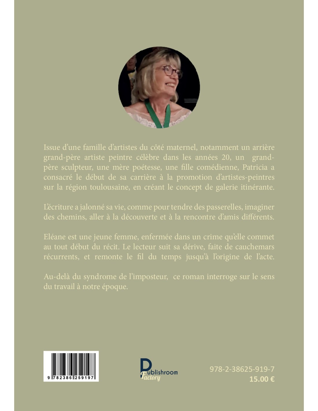 Issue d’une famille d’artistes du côté maternel, notamment un arrière-grand-père artiste peintre célèbre dans les années 20, un grand-père sculpteur, une mère poétesse, une fille comédienne, Patricia a consacré le début de sa carrière à la promotion d’artistes-peintres sur la région toulousaine, en créant le concept de galerie itinérante. L’écriture a jalonné sa vie, comme pour tendre des passerelles, imaginer des chemins, aller à la découverte et à la rencontre d’amis différents. Eléane est une jeune femme, enfermée dans un crime qu’elle commet au tout début du récit. Le lecteur suit sa dérive, faite de cauchemars récurrents, et remonte le fil du temps jusqu’à l’origine de l’acte. Au-delà du syndrome de l’imposteur, ce roman interroge sur le sens du travail à notre époque.