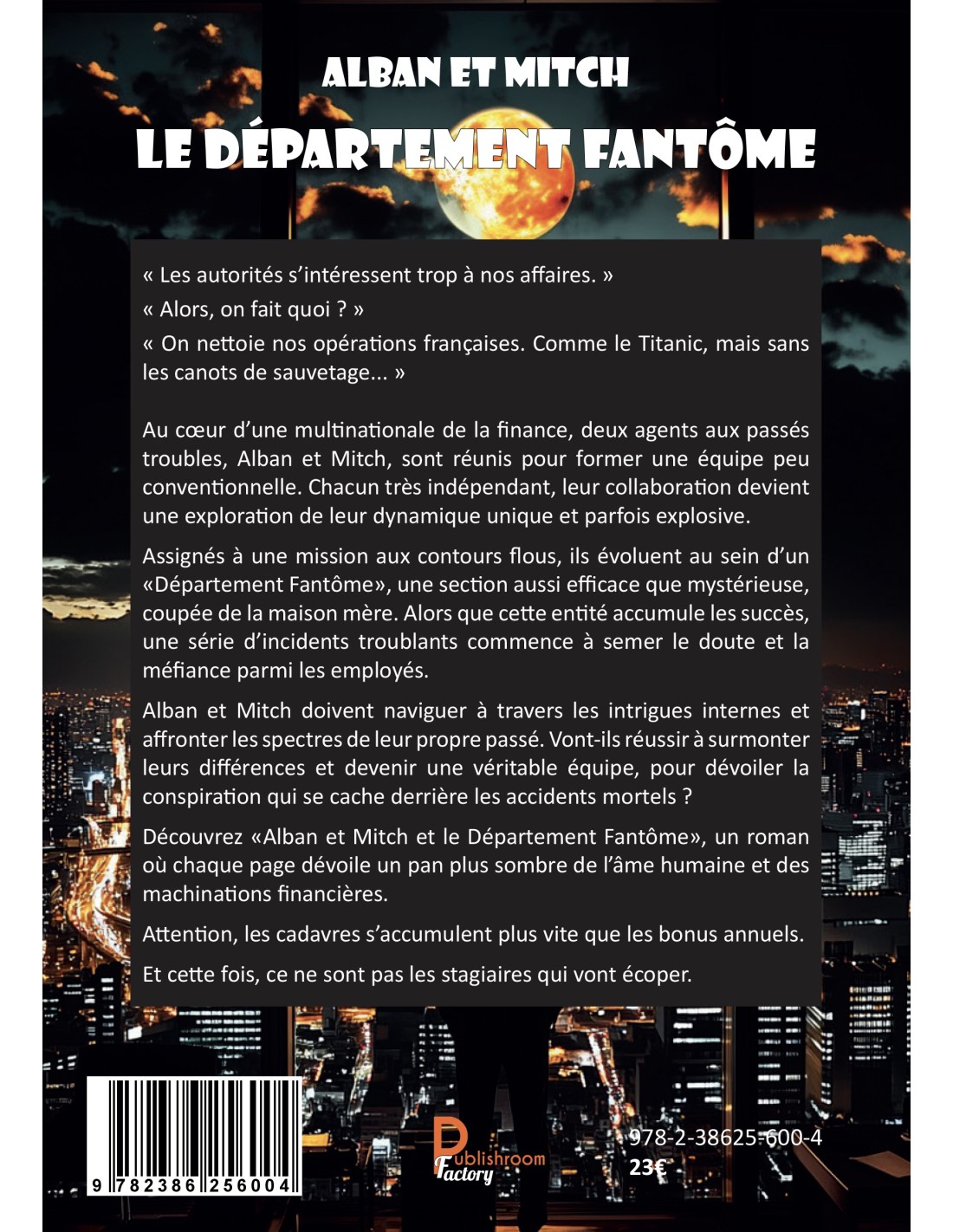 ALBAN ET MITCH LE DÉPARTEMENT FANTÔME « Les autorités s’intéressent trop à nos affaires. » « Alors, on fait quoi ? » « On nettoie nos opérations françaises. Comme le Titanic, mais sans les canots de sauvetage... » Au cœur d’une multinationale de la finance, deux agents aux passés troubles, Alban et Mitch, sont réunis pour former une équipe peu conventionnelle. Chacun très indépendant, leur collaboration devient une exploration de leur dynamique unique et parfois explosive. Assignés à une mission aux contours flous, ils évoluent au sein d’un « Département Fantôme », une section aussi efficace que mystérieuse, coupée de la maison mère. Alors que cette entité accumule les succès, une série d’incidents troublants commence à semer le doute et la méfiance parmi les employés. Alban et Mitch doivent naviguer à travers les intrigues internes et affronter les spectres de leur propre passé. Vont-ils réussir à surmonter leurs différences et devenir une véritable équipe, pour dévoiler la conspiration qui se cache derrière les accidents mortels ? Découvrez « Alban et Mitch et le Département Fantôme », un roman où chaque page dévoile un pan plus sombre de l’âme humaine et des machinations financières. Attention, les cadavres s’accumulent plus vite que les bonus annuels. Et cette fois, ce ne sont pas les stagiaires qui vont écoper.