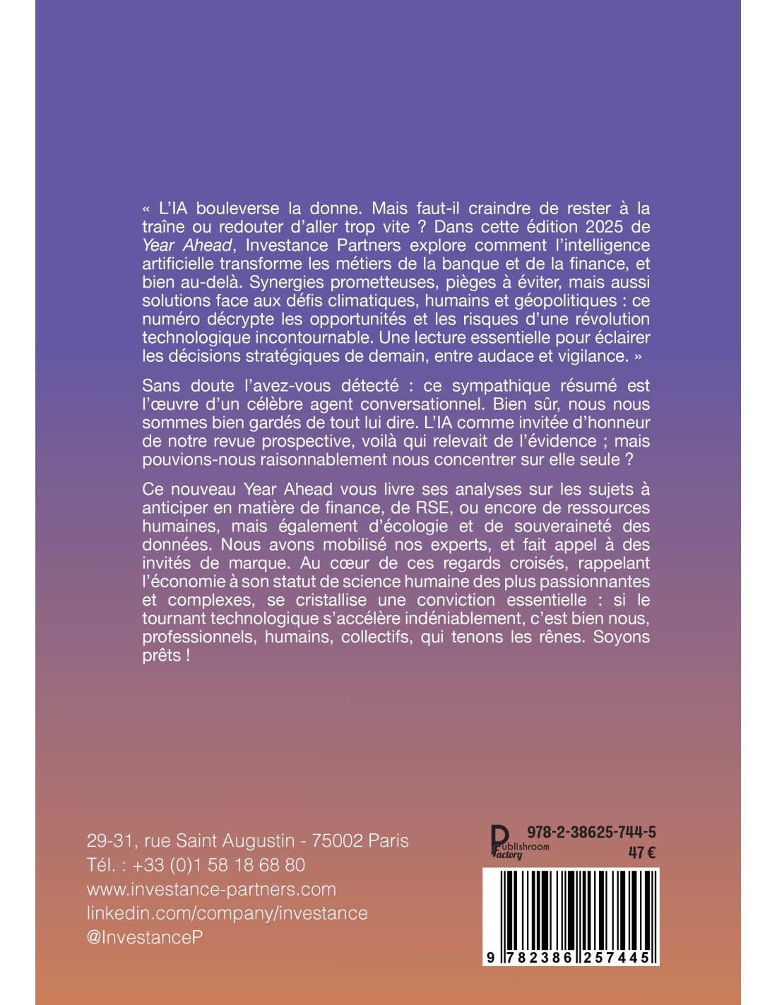 « L’IA bouleverse la donne. Mais faut-il craindre de rester à la traîne ou redouter d’aller trop vite ? Dans cette édition 2025 de Year Ahead, Investance Partners explore comment l’intelligence artificielle transforme les métiers de la banque et de la finance, et bien au-delà. Synergies prometteuses, pièges à éviter, mais aussi solutions face aux défis climatiques, humains et géopolitiques : ce numéro décrypte les opportunités et les risques d’une révolution technologique incontournable. Une lecture essentielle pour éclairer les décisions stratégiques de demain, entre audace et vigilance ». Sans doute l’avez-vous détecté : ce sympathique résumé est l’œuvre d’un célèbre agent conversationnel. Bien sûr, nous nous sommes bien gardés de tout lui dire. L’IA comme invitée d’honneur de notre revue prospective, voilà qui relevait de l’évidence ; mais pouvions-nous raisonnablement nous concentrer sur elle seule ? Ce nouveau Year Ahead vous livre ses analyses sur les sujets à anticiper en matière de finance, de RSE, ou encore de ressources humaines, mais également d’écologie et de souveraineté des données. Nous avons mobilisé nos experts, et fait appel à des invités de marque. Au cœur de ces regards croisés, rappelant l’économie à son statut de science humaine des plus passionnantes et complexes, se cristallise une conviction essentielle : si le tournant technologique s’accélère indéniablement, c’est bien nous, professionnels, humains, collectifs, qui tenons les rênes. Soyons prêts !