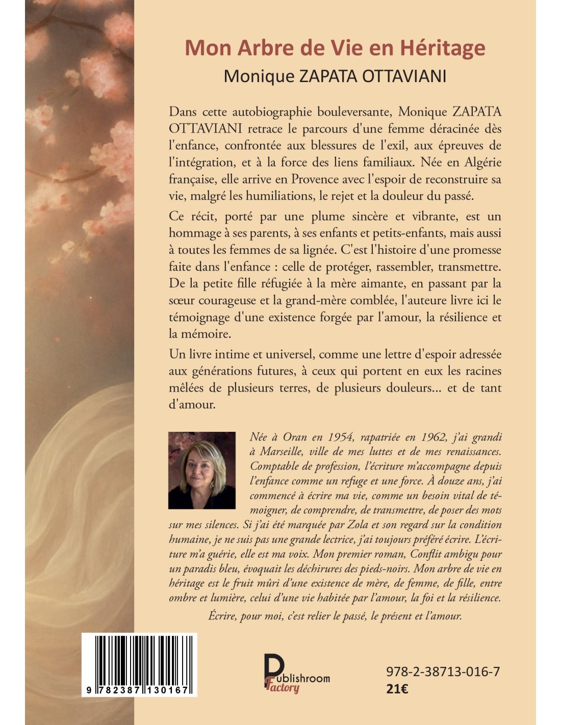Née à Oran en 1954, rapatriée en 1962, j’ai grandi à Marseille, ville de mes luttes et de mes renaissances. Comptable de profession, l’écriture m’accompagne depuis l’enfance comme un refuge et une force. À douze ans, j’ai commencé à écrire ma vie, comme un besoin vital de témoigner, de comprendre, de transmettre, de poser des mots sur mes silences. Si j’ai été marquée par Zola et son regard sur la condition humaine, je ne suis pas une grande lectrice, j’ai toujours préféré écrire. L’écriture m’a guérie, elle est ma voix. Mon premier roman, Conflit ambigu pour un paradis bleu, évoquait les déchirures des pieds-noirs. Mon arbre de vie en héritage est le fruit mûri d’une existence de mère, de femme, de fille, entre ombre et lumière, celui d’une vie habitée par l’amour, la foi et la résilience. Écrire, pour moi, c’est relier le passé, le présent et l’amour.