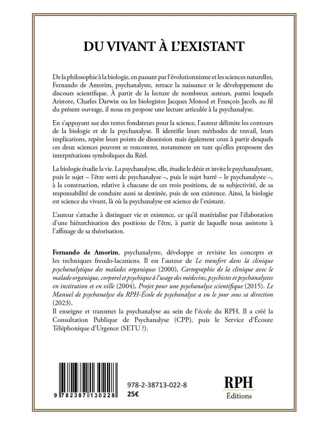 De la philosophie à la biologie, en passant par l’évolutionnisme et les sciences naturelles, Fernando de Amorim, psychanalyste, retrace la naissance et le développement du discours scientifique. À partir de la lecture de nombreux auteurs, parmi lesquels Aristote, Charles Darwin ou les biologistes Jacques Monod et François Jacob, au fil du présent ouvrage, il nous en propose une lecture articulée à la psychanalyse. En s’appuyant sur des textes fondateurs pour la science, l’auteur délimite les contours de la biologie et de la psychanalyse. Il identifie leurs méthodes de travail, leurs implications, repère leurs points de dissension mais également ceux à partir desquels ces deux sciences peuvent se rencontrer, notamment en tant qu’elles proposent des interprétations symboliques du Réel. La biologie étudie la vie. La psychanalyse, elle, étudie le désir et invite le psychanalysant, puis le sujet – l’être sorti de psychanalyse –, puis le sujet barré – le psychanalyste –, à la construction, relative à chacune de ces trois positions, de sa subjectivité, de sa responsabilité de conduire aussi sa destinée, puis de son existence. Ainsi, la biologie est science du vivant, là où la psychanalyse est science de l’existant. L’auteur s’attache à distinguer vie et existence, ce qu’il matérialise par l’élaboration d’une hiérarchisation des positions de l’être, à partir de laquelle nous assistons à l’affinage de sa théorisation. Fernando de Amorim, psychanalyste, développe et revisite les concepts et les techniques freudo-lacaniens. Il est l’auteur de Le transfert dans la clinique psychanalytique des malades organiques (2000), Cartographie de la clinique avec le malade organique, corporel et psychique à l’usage des médecins, psychistes et psychanalystes en institution et en ville (2004), Projet pour une psychanalyse scientifique (2015). Le Manuel de psychanalyse du RPH-École de psychanalyse a vu le jour sous sa direction (2023). Il enseigne et transmet la psychanalyse au sein de l’école du RPH. Il a créé la Consultation Publique de Psychanalyse (CPP), puis le Service d’Écoute Téléphonique d’Urgence (SETU ?).