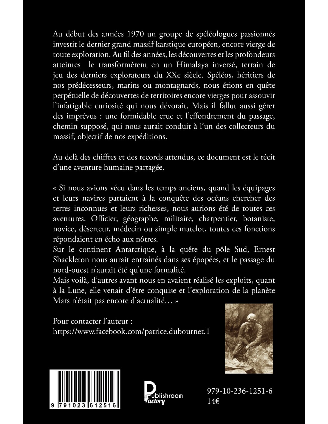 Au début des années 1970 un groupe de spéléologues passionnés investit le dernier grand massif karstique européen encore vierge de toute exploration. Au fil des années, les découvertes et les profondeurs atteintes le transformèrent en un Himalaya inversé, terrain de jeu des derniers explorateurs du XXe siècle. Spéléos, héritiers de nos prédécesseurs, marins ou montagnards, nous étions en quête perpétuelle de découvertes de territoires encore vierges pour assouvir l’infatigable curiosité qui nous dévorait. Mais il fallut aussi gérer des imprévus : une formidable crue et l’effondrement du passage, chemin supposé, qui nous aurait conduits à l’un des collecteurs du massif, objectif de nos expéditions.