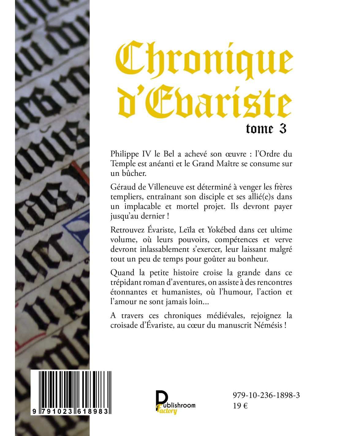 Quand la petite histoire croise la grande dans ce trépidant roman d’aventures, on assiste à des rencontres étonnantes et humanistes, où l’humour, l’action et l’amour ne sont jamais loin... À travers ces chroniques médiévales, rejoignez la croisade d’Évariste, au cœur du manuscrit Némésis !