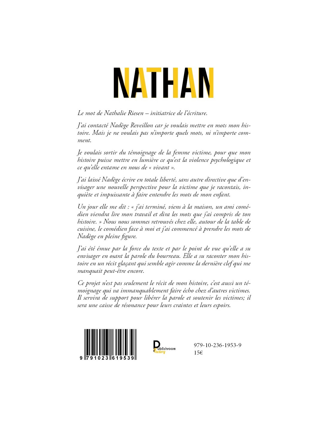 j'ai laissé Nadège écrire en totale liberté, sans autre directive que d'envisager une nouvelle perspective pour la victime que je racontais, inquiète et impuissante à faire entendre les mots de mon enfant.