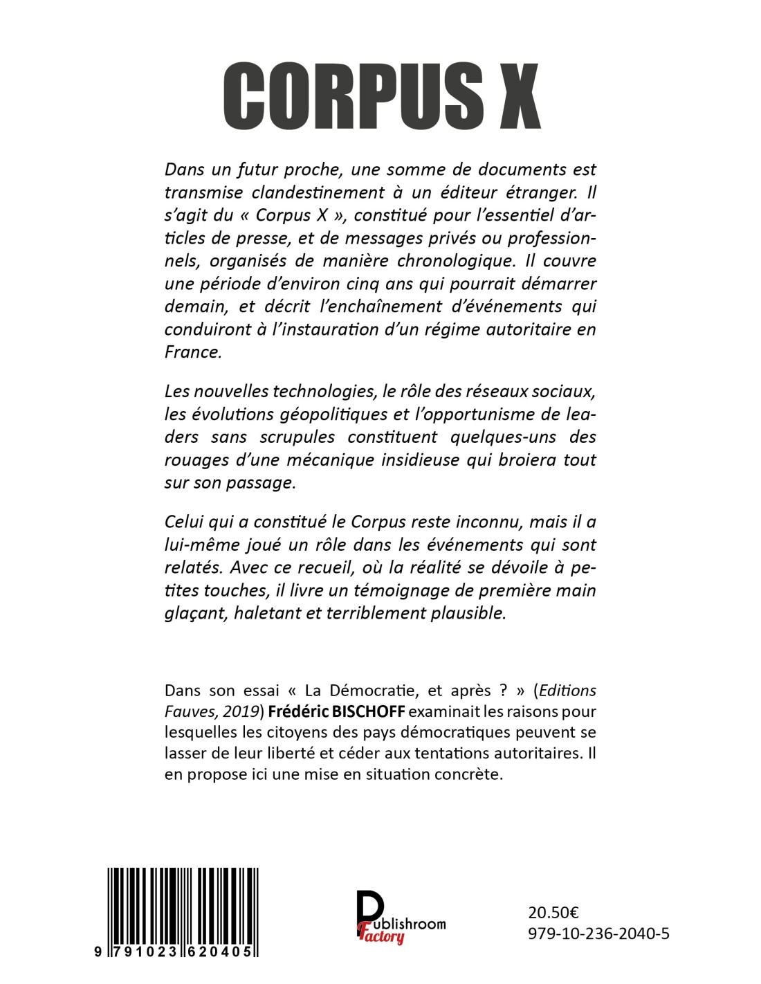 Dans un futur proche, une somme de documents est transmise clandestinement à un éditeur étranger. Il sagit du « Corpus X », constitué pour lessentiel darticles de presse, et de messages privés ou professionnels, organisés de manière chronologique. Il couvre une période denviron cinq ans qui pourrait démarrer demain, et décrit lenchaînement d’événements qui conduiront à linstauration dun régime autoritaire en France.
