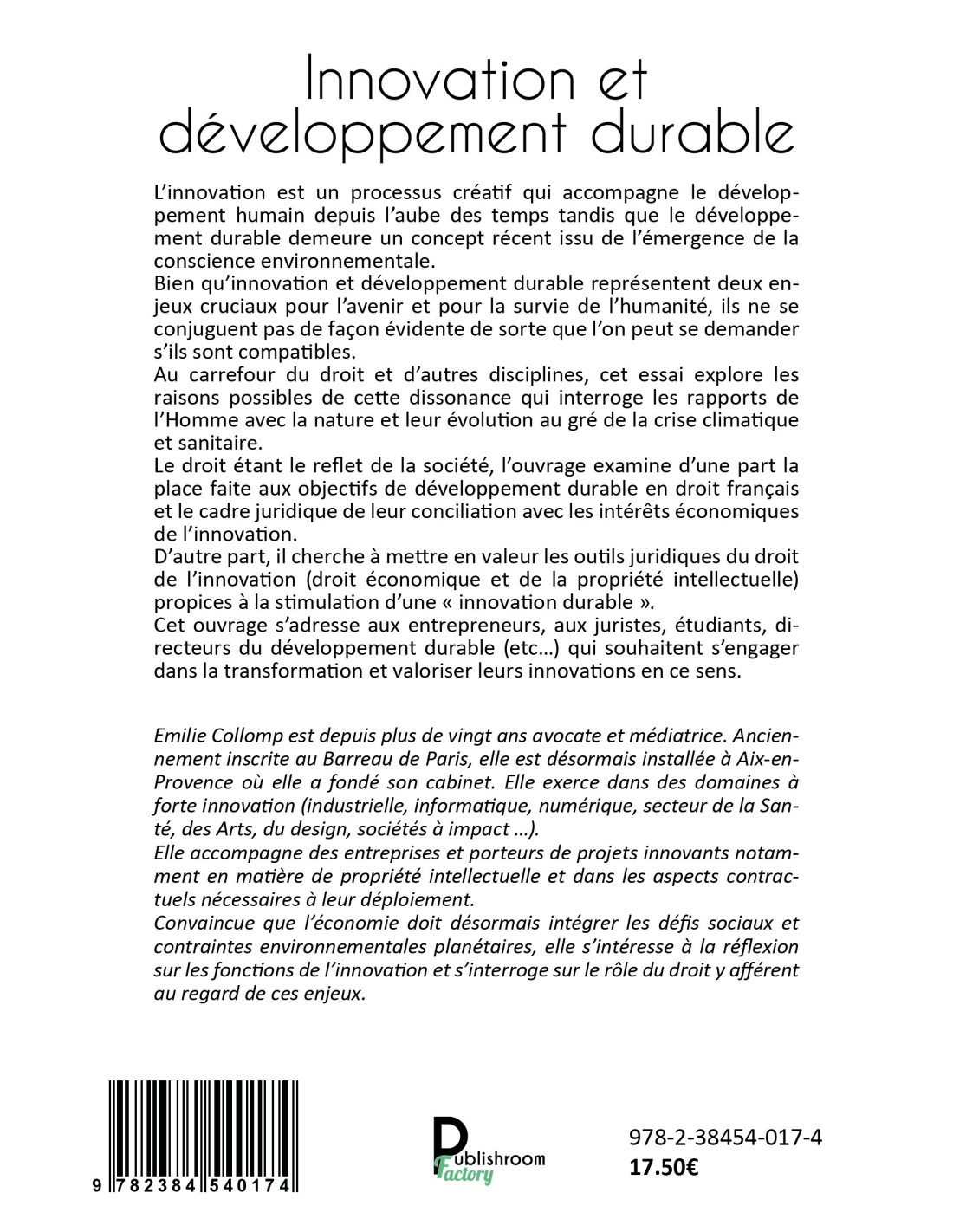 Cet ouvrage s’adresse aux entrepreneurs, aux juristes, étudiants, directeurs du développement durable (etc…) qui souhaitent s’engager dans la transformation et valoriser leurs innovations en ce sens.