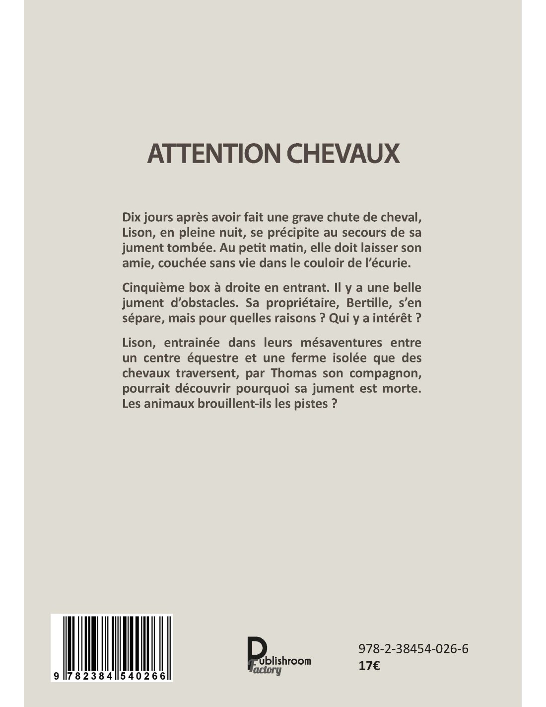 Lison, entraînée dans leurs mésaventures entre un centre équestre et une ferme isolée que des chevaux traversent, par Thomas son compagnon, pourrait découvrir pourquoi sa jument est morte. Les animaux brouillent-ils les pistes ?