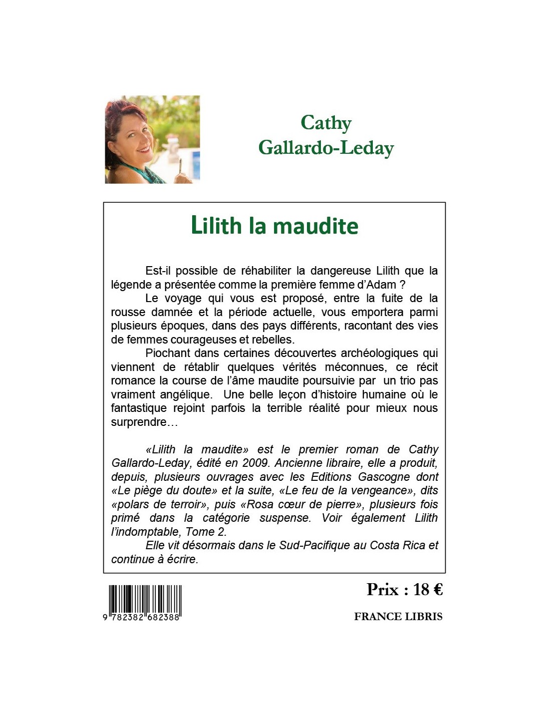 « Lilith la maudite » est le premier roman de Cathy Gallardo-Leday, édité en 2009. Ancienne libraire, elle a produit, depuis, plusieurs ouvrages avec les Editions Gascogne dont « Le piège du doute » et la suite, « Le feu de la vengeance », dits « polars de terroir », puis « Rosa cœur de pierre », plusieurs fois primé dans la catégorie suspense. Voir également Lilith l’indomptable, Tome 2.
