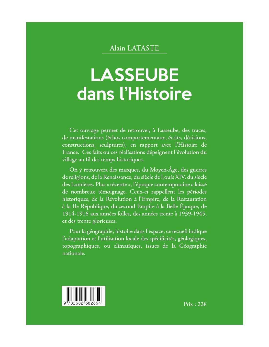 Cet ouvrage permet de retrouver, à Lasseube, des traces, de manifestations (échos comportementaux, écrits, décisions, constructions, sculptures), en rapport avec l’Histoire de France. Ces faits ou ces réalisations dépeignent l’évolution du village au fil des temps historiques.