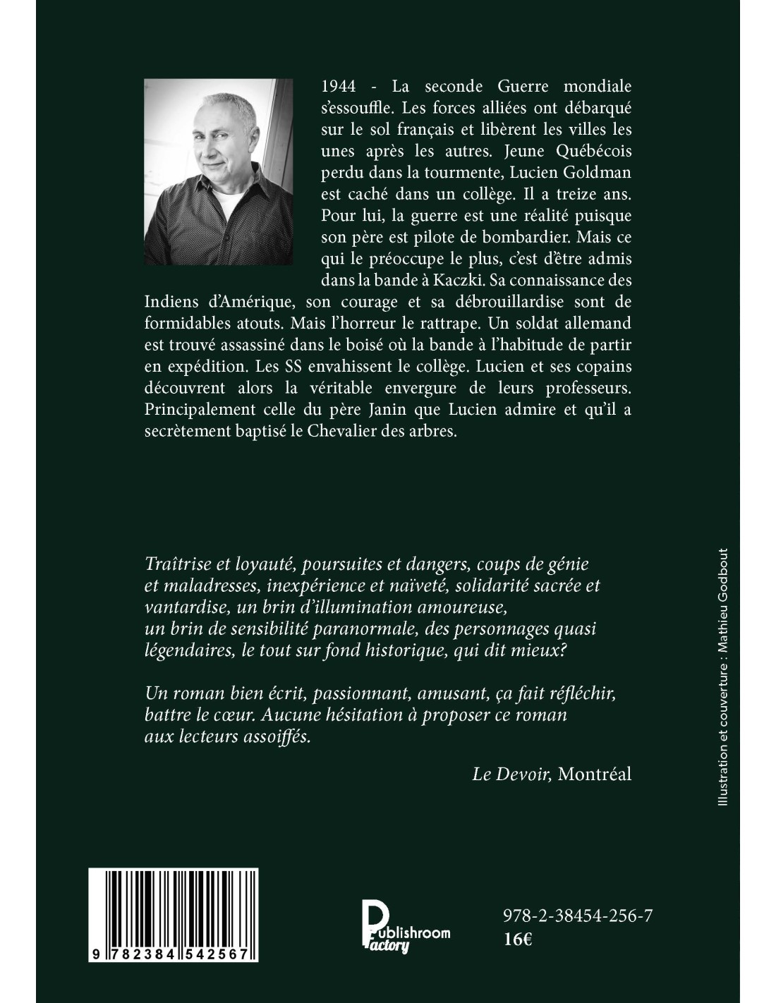 1944 - La seconde Guerre mondiale s’essouffle. Les forces alliées ont débarqué sur le sol français et libèrent les villes les unes après les autres. Jeune Québécois perdu dans la tourmente, Lucien Goldman est caché dans un collège. Il a treize ans. Pour lui, la guerre est une réalité puisque son père est pilote de bombardier. Mais ce qui le préoccupe le plus, c’est d’être admis dans la bande à Kaczki. Sa connaissance des Indiens d’Amérique, son courage et sa débrouillardise sont de formidables atouts. Mais l’horreur le rattrape. Un soldat allemand est trouvé assassiné dans le boisé où la bande à l’habitude de partir en expédition. Les SS envahissent le collège. Lucien et ses copains découvrent alors la véritable envergure de leurs professeurs. Principalement celle du père Janin que Lucien admire et qu’il a secrètement baptisé le Chevalier des arbres.