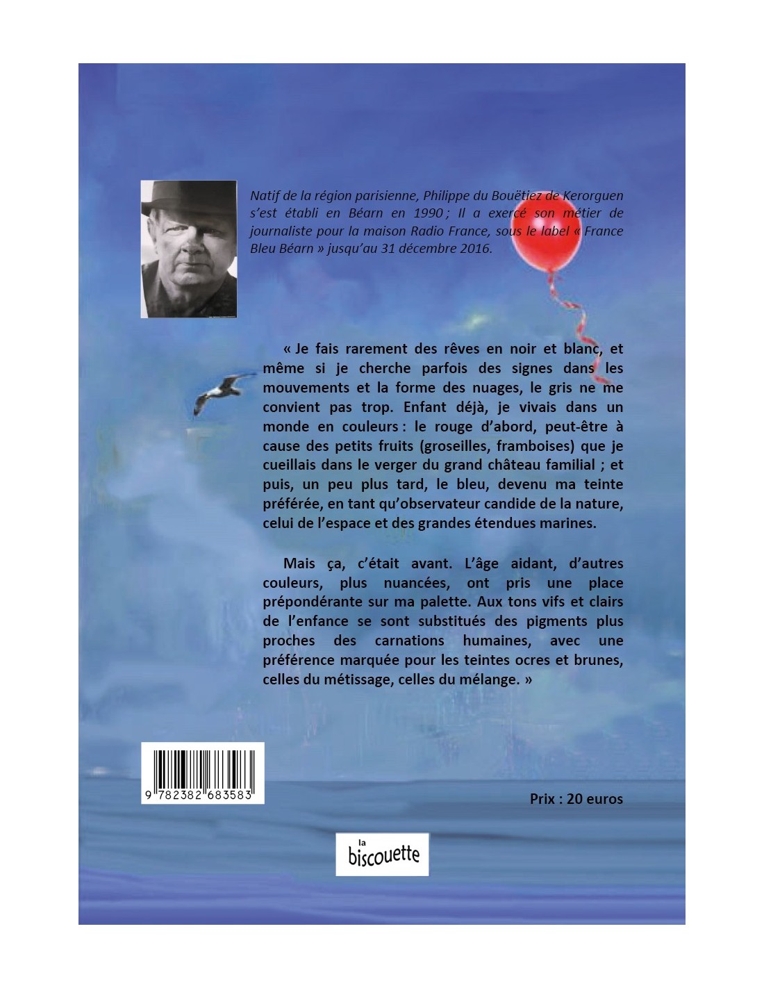 « Je fais rarement des rêves en noir et blanc, et même si je cherche parfois des signes dans les mouvements et la forme des nuages, le gris ne me convient pas trop. Enfant déjà, je vivais dans un monde en couleurs : le rouge d’abord, peut-être à cause des petits fruits (groseilles, framboises) que je cueillais dans le verger du grand château familial ; et puis, un peu plus tard, le bleu, devenu ma teinte préférée, en tant qu’observateur candide de la nature, celui de l’espace et des grandes étendues marines. Mais ça, c’était avant. L’âge aidant, d’autres couleurs, plus nuancées, ont pris une place prépondérante sur ma palette. Aux tons vifs et clairs de l’enfance se sont substitués des pigments plus proches des carnations humaines, avec une préférence marquée pour les teintes ocres et brunes, celles du métissage, celles du mélange. »